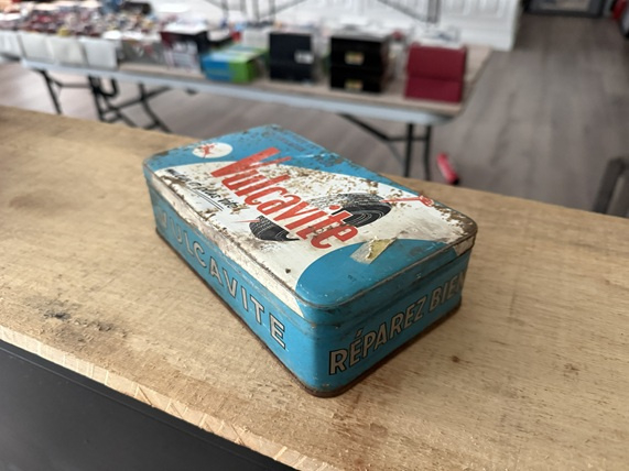 Dit is meer dan een object; het is een stille getuige van de gouden tijd van de road trip. Stel je voor: een zonovergoten landweg ergens in Frankrijk, de wind door de haren, en plots... een lekke band. Dit kleine, metalen blik, met zijn charmante patina en de optimistische slogan "mieux et plus vite!", was de stille held die de reis redde en het avontuur kon voortzetten.
