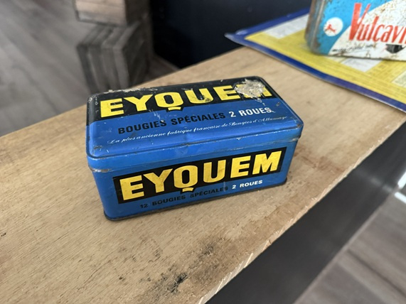 Dit charmante, blauwe blik is een authentiek verzamelobject van het historische Franse merk Eyquem, bekend als de oudste bougiefabriek van Frankrijk. Het blik, met de opdruk "BOUGIES SPÉCIALES 2 ROUES" (speciale bougies voor 2 wielen), ademt de sfeer van een vervlogen tijdperk van brommers, scooters en motoren.