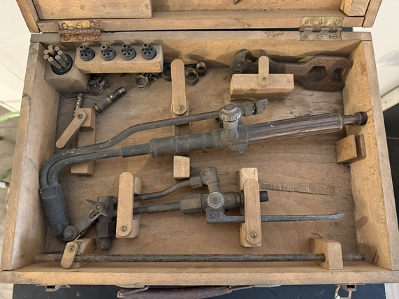 Deze professionele autogeen las- en snijset werd gemaakt door J.W. Müller GmbH Opladen. Hij zit in de originele maatgemaakte houten koffer met prachtige vintage patina en de originele fabrieksstempel op het deksel.